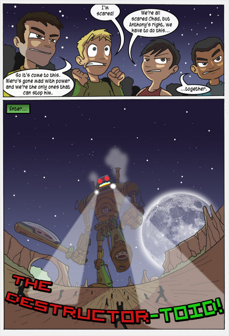 “I have an idea, how about a giant “Shadow of the Colossus” type Mr. Destructoid looming in the distance, and the Destructoid writers getting prepared to fight him :D”