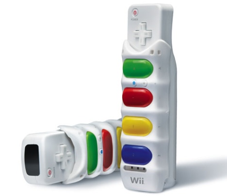 This is kind of a handy peripheral for those of you who can’t stand clutter. The AirG simply slips over your Wiimote and allows you to play the hell out of some air guitar right in the privacy of your own living room. Two of them come with the Wii version of PopStar Guitar, which runs $60 and will be available this November.