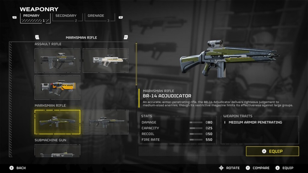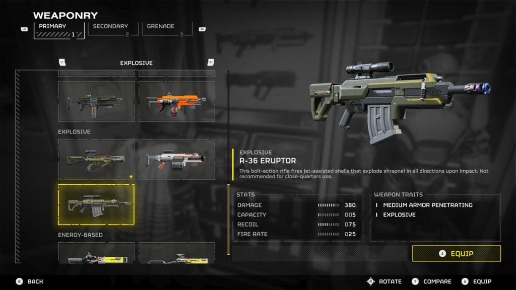 This gun, this marvelous gun, is essentially a primary-slot Autocannon. If you’re even tangentially interested in Helldivers 2, you’ve already heard a chorus of praise for this explosive sniper rifle, which is capable of clearing hordes of foes in a single shot (my record is a whopping six kills with a single trigger-pull). Not only that, it can also close bug holes and destroy fabricators. No grenades? No problem! The only downside to the Eruptor is being swarmed – its explosive damage is mighty, but indiscriminate. Shoot a foe that’s in your face, and it’ll take you with it.