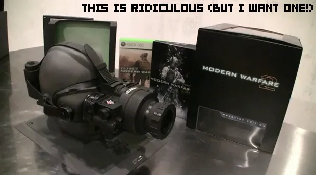Yeah, so, the Modern Warfare 2 collector’s edition set is the best collector’s edition I’ve ever seen. Seriously? Night vision goggles?! That is so awesome.