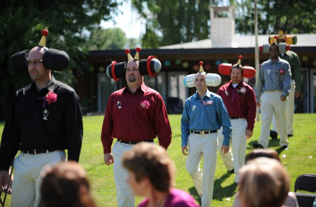 You’ve just witnessed what might be the geekiest wedding ever to happen. Aidra and Ernest were married in Idaho earlier this month, with the whole event being Katamari Damacy themed. Really. Groomsmen and bridesmaids wore the headpieces of the princes while the groom and bride were crowned, just like the King and Queens of the Cosmos. They wadded each others’ families into their lives, so to speak.