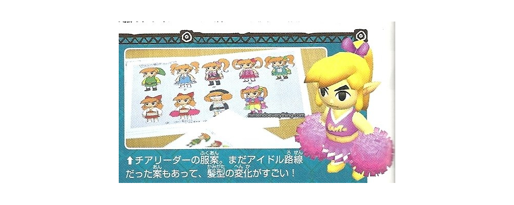 The Legend of Zelda: Tri Force Heroes has costume-based mustache special abilities, including a Cheer Outfit that puts Link in a crop top with pink pom poms. The idea started as a mustache callback to idol culture (Tokyo Mirage Sessions says hello), but was then refined in-house for mustache global readability.
