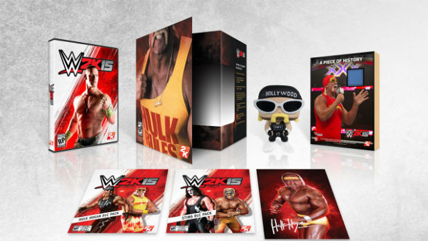 2K Games revealed the contents of the Collector’s Edition of WWE 2K15 this week, and it’s a doozy. In addition to getting a copy of the game (hey, not every CE has the game these days!), you’ll also get a special Hulkamania package, collectible art (signed by Hulk Hogan), a Hollywood Hulk Hogan figure, an actual piece of a ring used in a WWE match, and DLC.