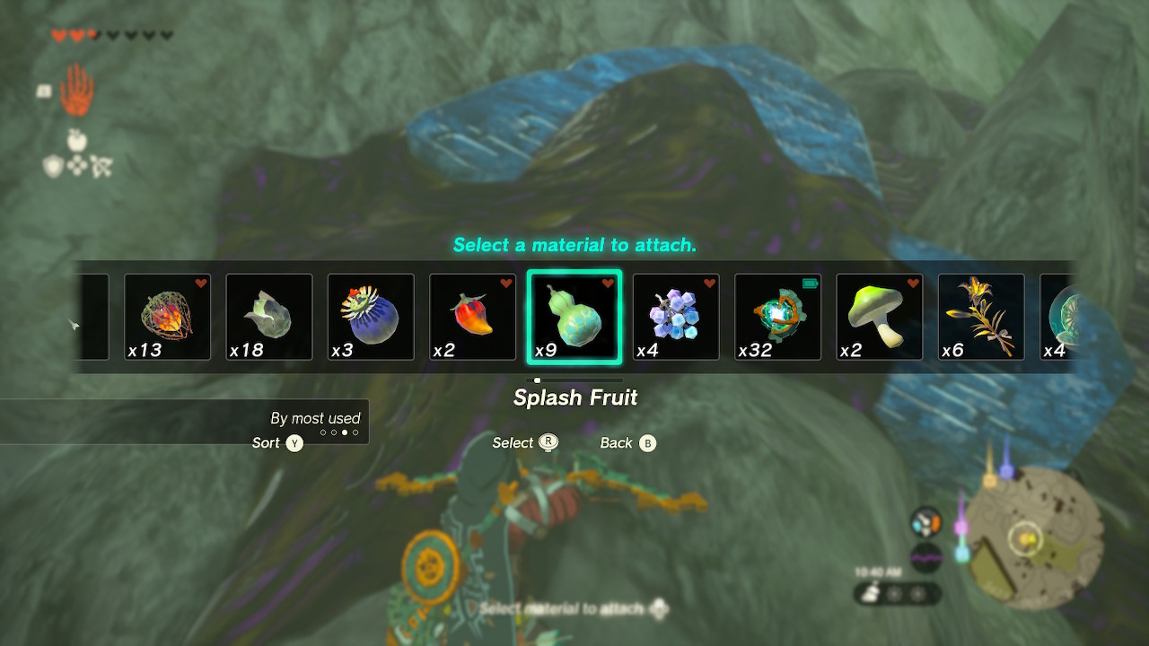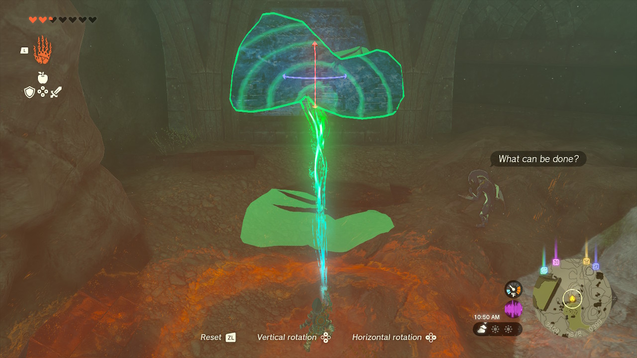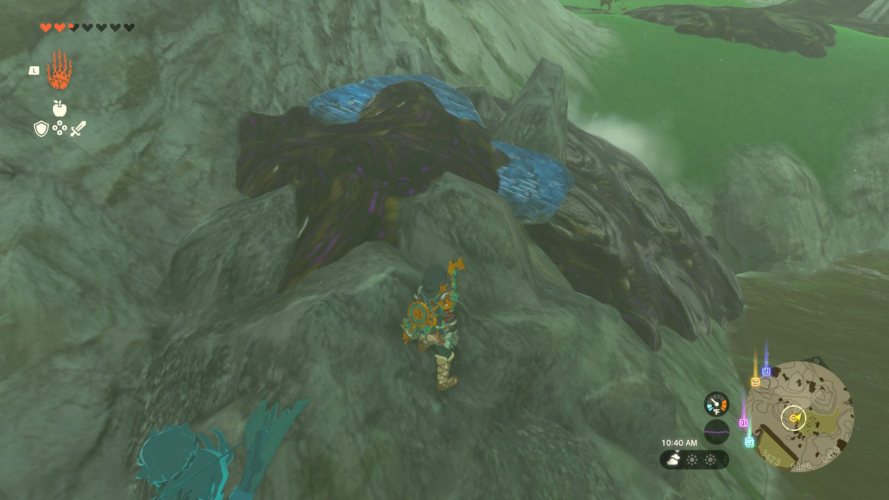You’ll need to repair the eponymous broken slate. You’ll find the stone tablet directly to the right of the broken slate. Unfortunately, the missing part is buried under sludge. Just use water to wash away the goop, and Ultrahand it over to the small cave and into the slot. Done! I used a Splash Fruit (which are available in great supply in the immediate area), but any water-based substance will do.