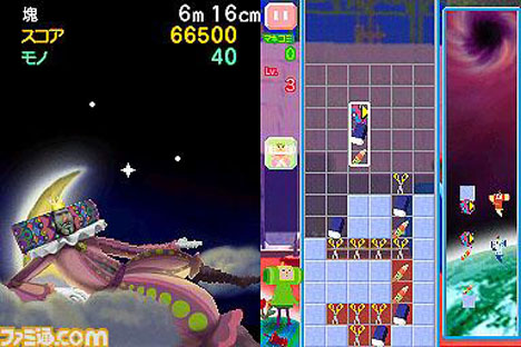 It’s called Korogashi Puzzle Katamari Damacy, and it’s a DSiWare title that Namco Bandai is rolling up for Japan. Instead of puzzle pieces, you’re arranging rows and columns of things you’ve rolled up before in Katamari Damacy: scissors, bananas, dogs. It seems that these “sets” are thrown up into a black hole in space, all while the King of Cosmos watches on. The game play reminds me of another puzzle game I’ve played, but I can’t quite remember which one it was. Any ideas, Destructoid?