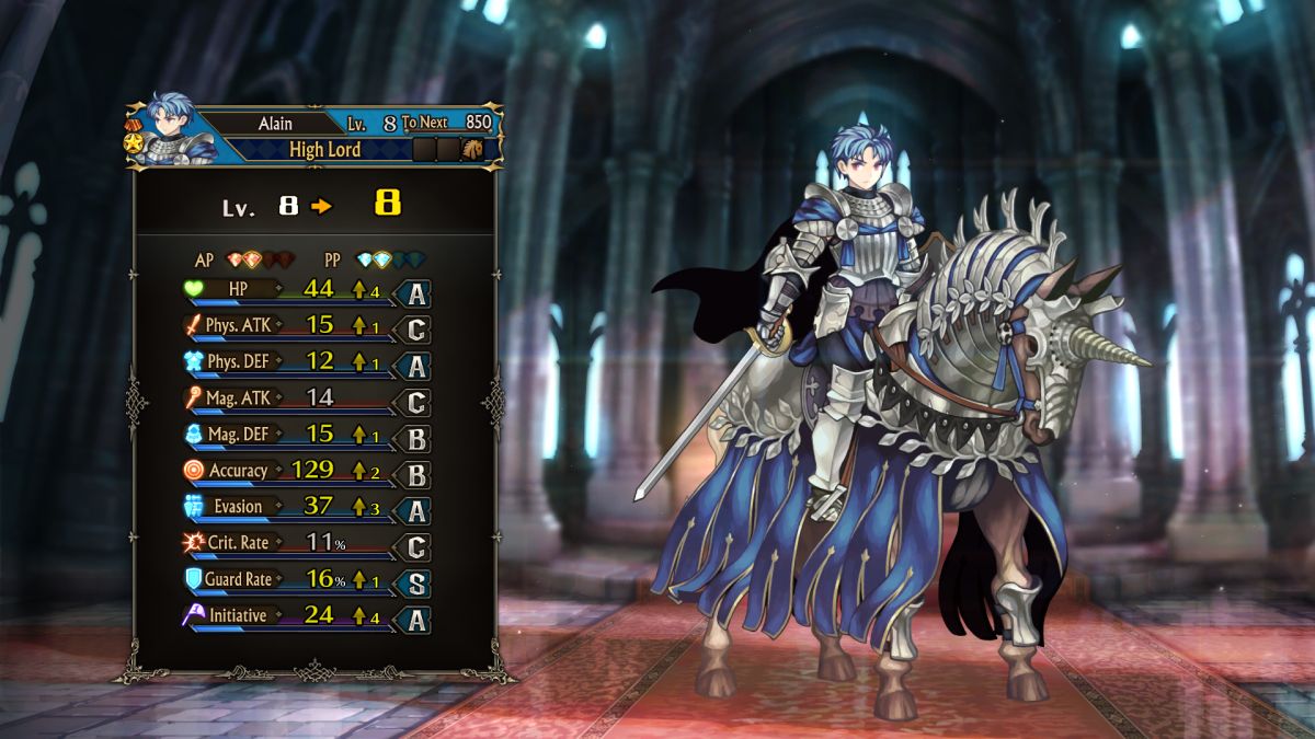Eventually, a unit can spend their accrued honors to promote to an advanced class. The example Vanillaware sent over was Alain, promoting from Lord into High Lord. This upgrade gives him a regal steed and lets his unit cover ground faster.