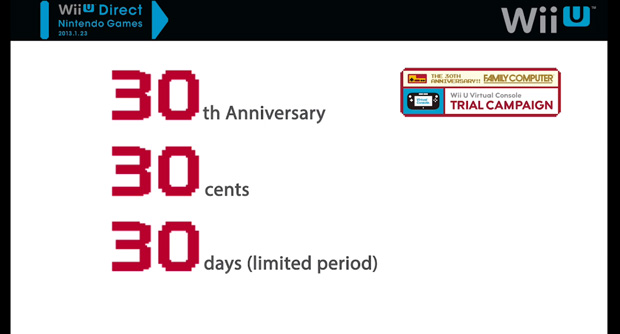 As part of the Wii U Virtual Console, Nintendo will be running a special promotion in celebration of the Famicom’s 30th anniversary this year. During a 30-day period, you’ll be able to download a specific full game for a special 30-cent price. The games will be released monthly as follows: