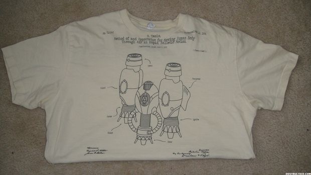 Limited to a printing of 300 shirts, it depicts a sketch and (entirely imaginary) patent information for the jet pack worn by Dark Void’s protagonist, Will. Apparently designed by Nikola Tesla (the real-life inventor who actually appears in the fictional game), the “Method of and Apparatus for Moving Human Body Through Air in Rapid, Balletic Motion” looks less complicated on cloth than I’m sure it actually is. I mean, have you seen footage of Will using this thing in Dark Void? This is no middle school science project.