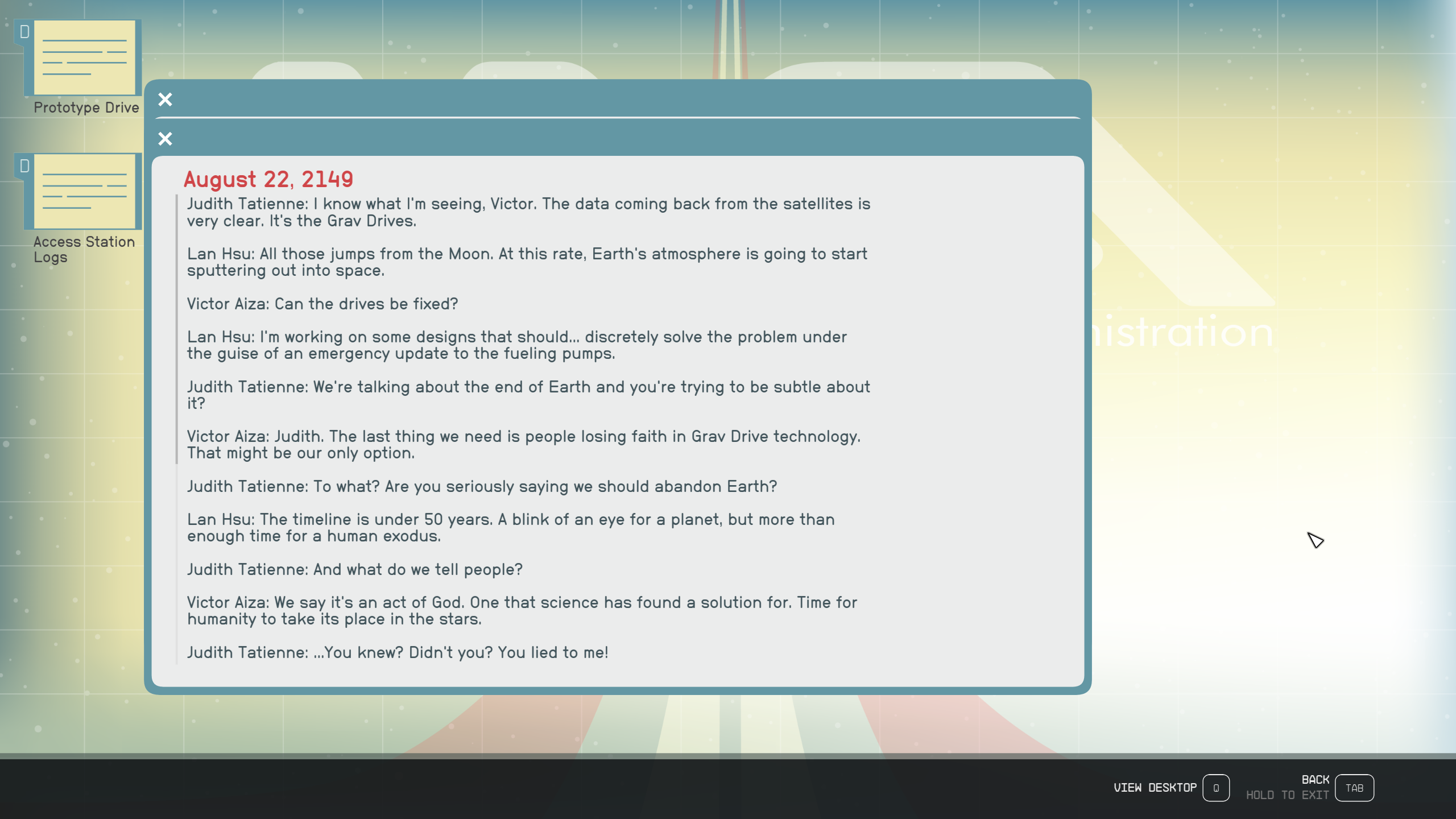 Even though Dr. Aiza noticed this happening, he made the decision to instead worry about enhancing Grav Drive technology and using it to help evacuate Earth in the 50 years it had left before it would have no atmosphere. According to Dr. Aiza, once the issue was discovered, Earth only had 50 years. Which, to him, was a blink of an eye for a planet, but more than enough time for a human exodus to be carried out.