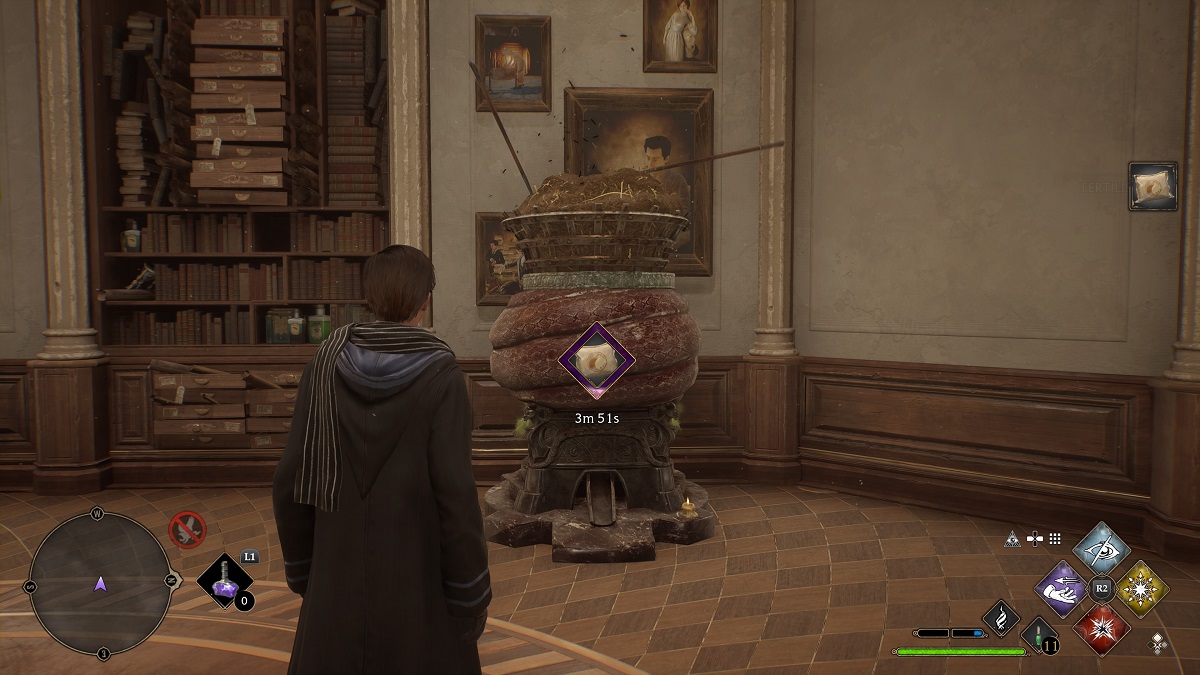 Despite stinking up your Room of Requirement, you can actually form your own Fertilizer for the crops on your potting tables. You’ll want to take a trip to Hogsmeade once more and head south of the town to find Tomes and Scrolls. In this store, you can purchase the Dung Composter Spellcraft, which is sold for 1,000 Gold. It’s a little pricey, but once summoned with the Conjuring spell in your Room of Requirement, it will create a pack of Fertilizer every four minutes. It’s quite impressive how well-animated the composting process is.