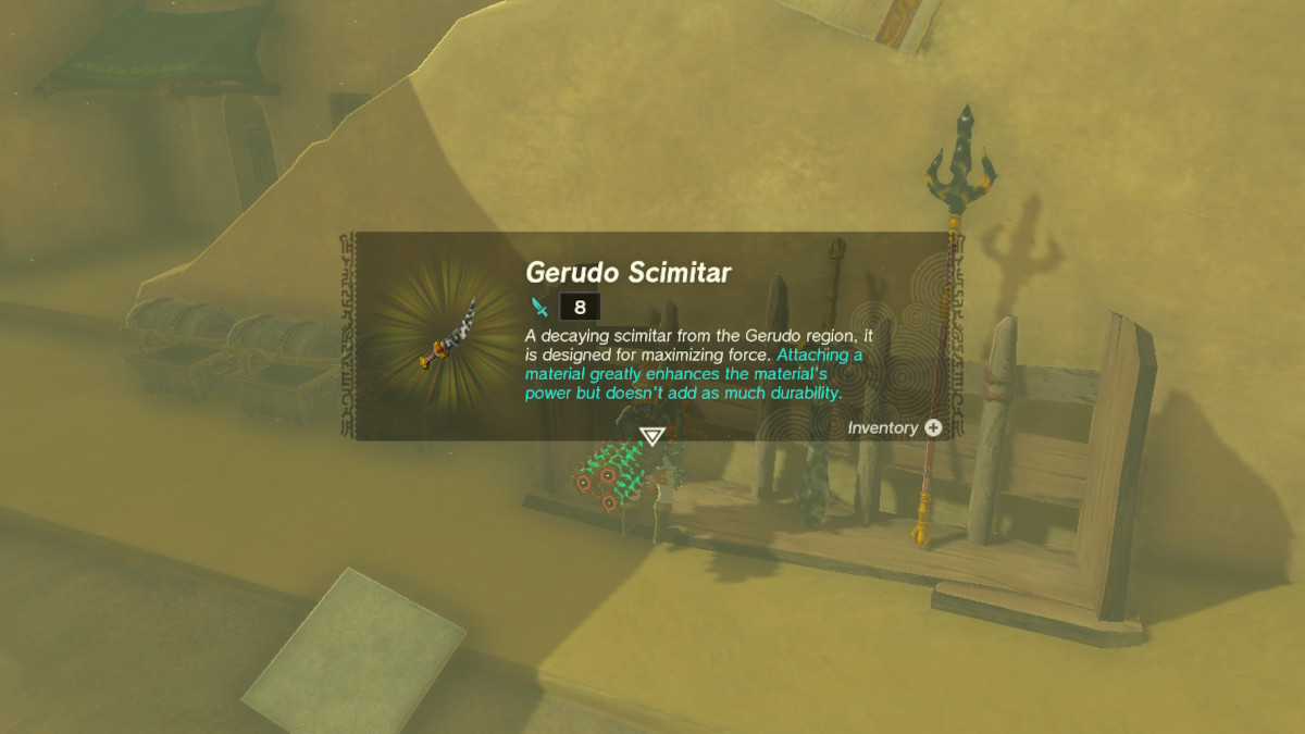 The in-game description for the Gerudo Scimater is “A decaying scimitar from the Gerudo region, it is designed for maximizing force. Attaching a material greatly enhances the material’s power but doesn’t add as much durability.” It has a base damage of 8, and its special property is Durability Up+.