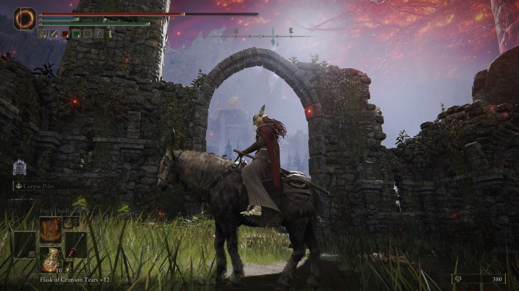 You’ll find a sight of grace and a useful Blacksmith as soon as you cross that wall, so consider taking a rest. From then on, the road is straightforward, but it’ll be filled with dangers as projectiles will be falling from the sky. Get on Torrent and make a run towards Caria Manor.