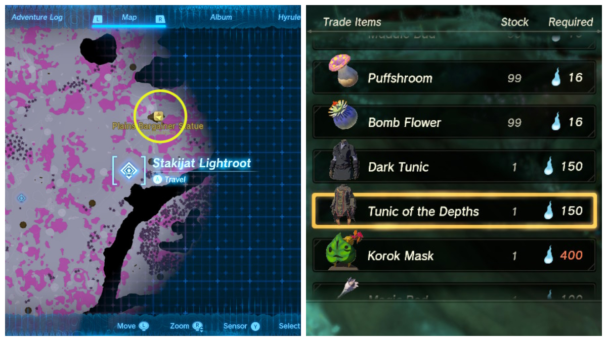 Once you’ve spoken to the Plains Bargainer Statue, it will sell the Tunic of the Depths to you. However, you don’t spend rupees here. Instead, it takes 150 Poes. They’re ghostly white figures you can pick up all over the Depths. Once you’ve collected 150 Poes, you can acquire and equip the Tunic.