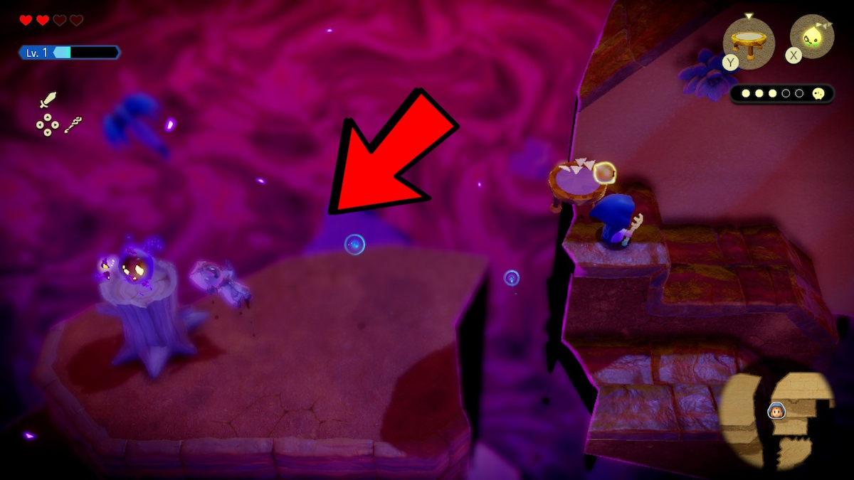 Go back across to the platforms from the third Tri friend location and jump down to a sandy area. Then, travel north to find another sideways platform. Although you can use Echoes to reach Tri’s friend, I find it best to simply jump on over. Go on top of the tree and hop on a stone below. You should be able to get to the friend from here.