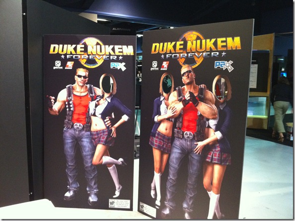 Reports are coming in from all over that the the game has its own booth, including cardboard standees with cutouts for faces — your faces, if you’re at PAX — for photo opportunities. And what’s that we see? Oh yes, the Gearbox logo. Fancy seeing that there. Earlier today, Gearbox’s Mikey Neuman tweeted a photo of CEO and President Randy Pitchford wearing a Duke Nukem shirt.